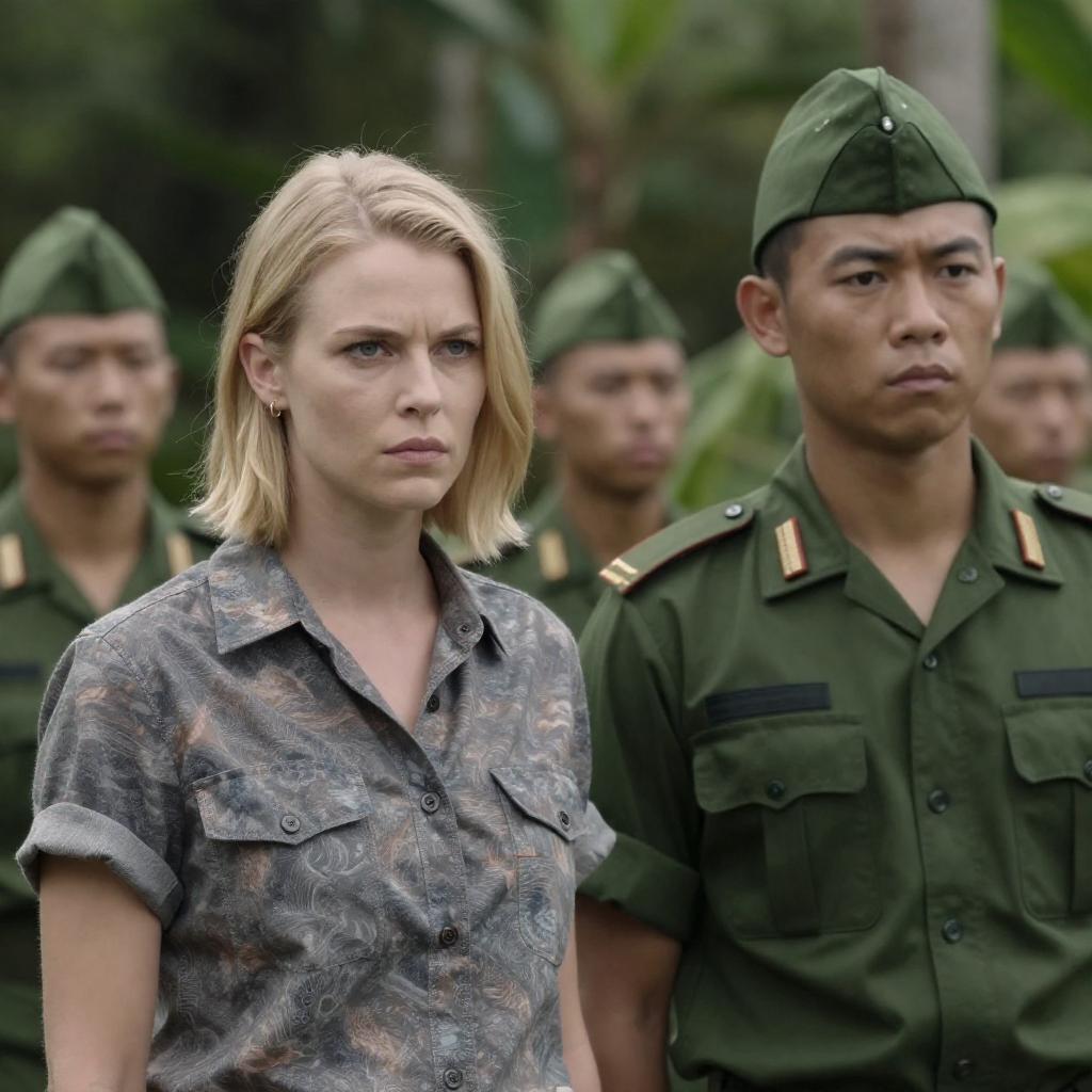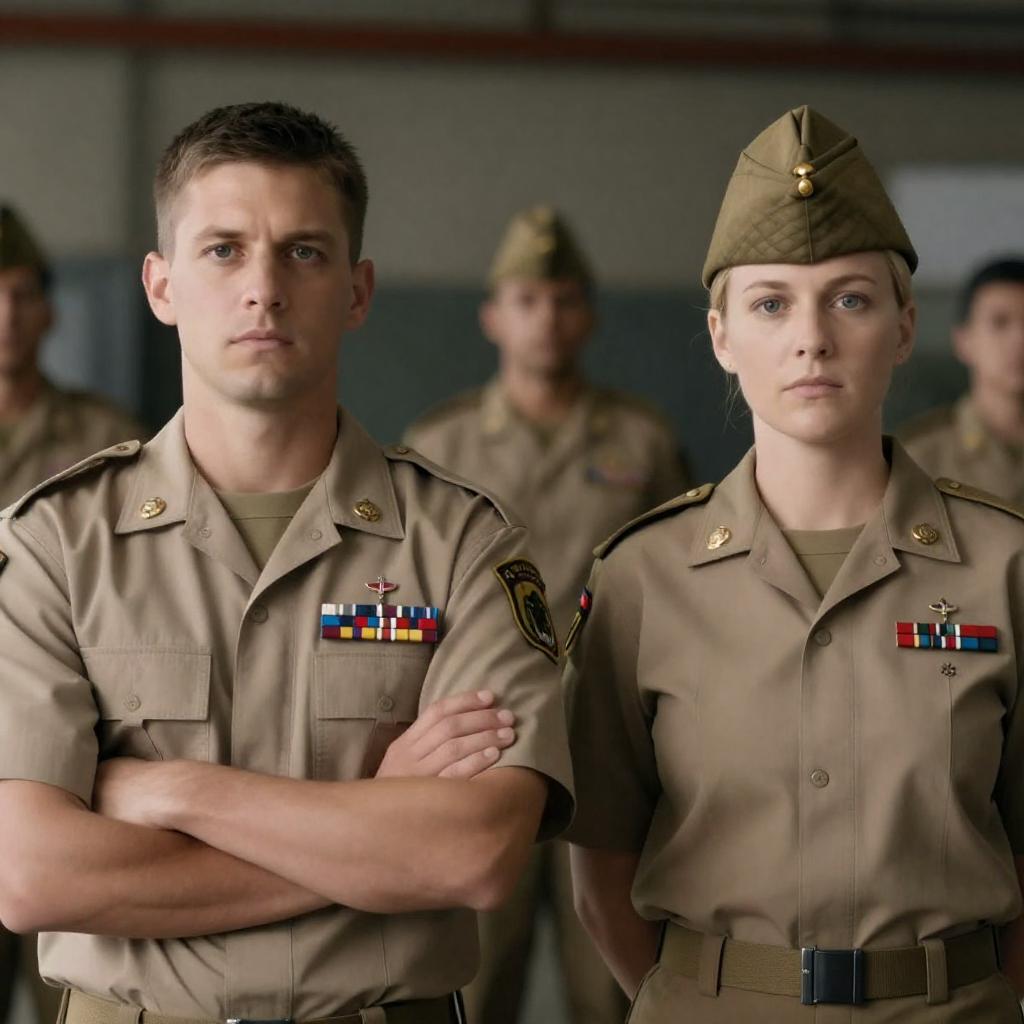 Photograph of two military personnel. Male on left, short brown hair, tan uniform, arms crossed, serious expression. Female on right, blonde hair, tan uniform, peaked cap, medals, neutral expression. Background includes dimly lit industrial setting, blurred individuals.