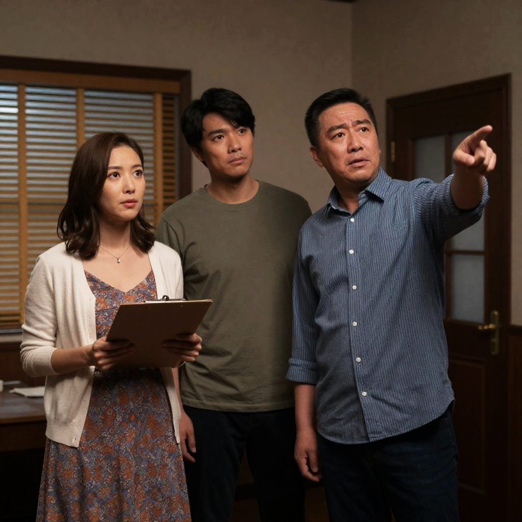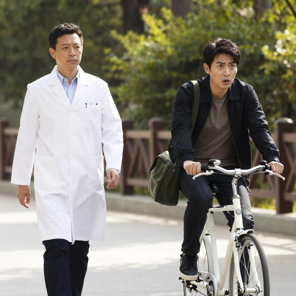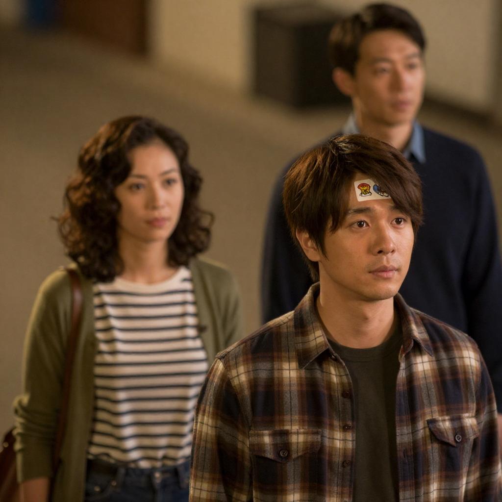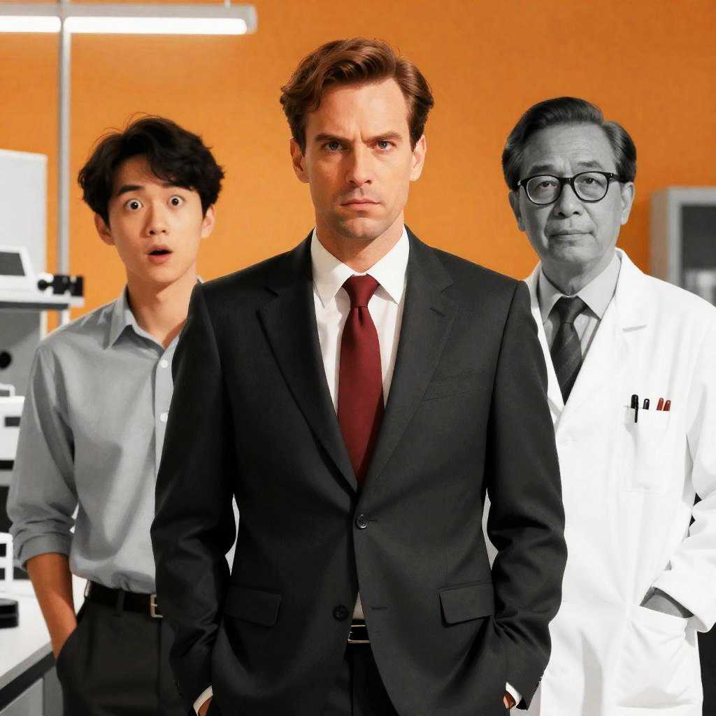 Movie poster of "Abbey" directed by Terry Carter. Main character, a man with medium-length black hair, wearing a white lab coat over a yellow shirt, gestures with arms outstretched. Smaller headshot of the same man on the left. Background features colorful bar interior. Names of cast members in bottom right corner. Yellow in upper left corner. Actress in white dress in bottom left corner.