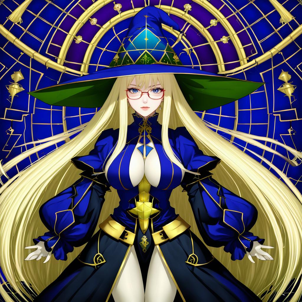 Aesc (fate), fate/grand order, 1girl, blue eyes, glasses, blonde hair, long hair, very long hair, large breasts, witch hat, long sleeves, by artist binsen, anime