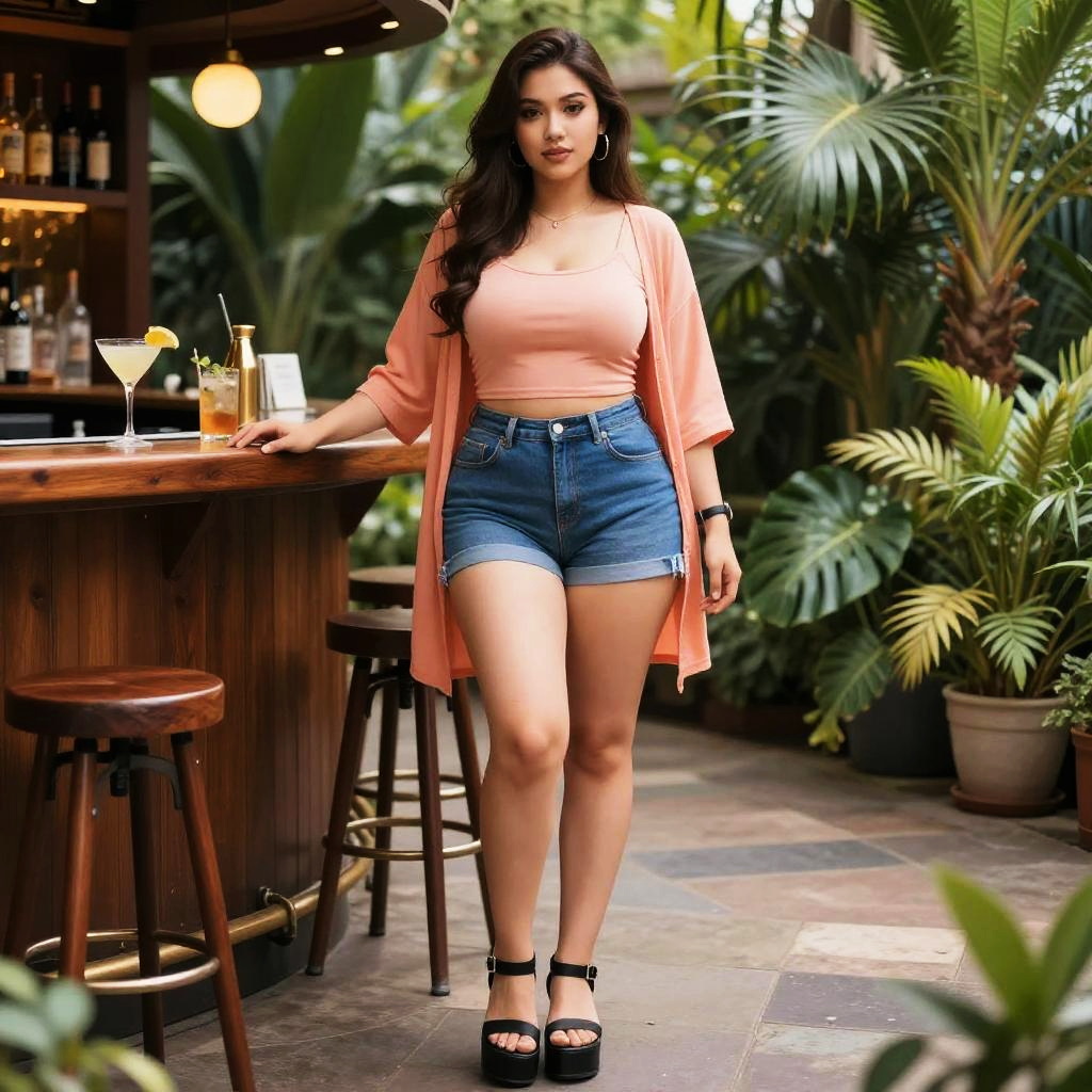 A Pear-shaped body type woman, in a digital manga style, wearing fitted mid-blue denim shorts, a cropped pastel peach tank top, and a lightweight coral cardigan, stands at a cocktail bar botanical garden, with black chunky platform sandals and a slim black watch. Sexy. Pretty face and beutiful eyes