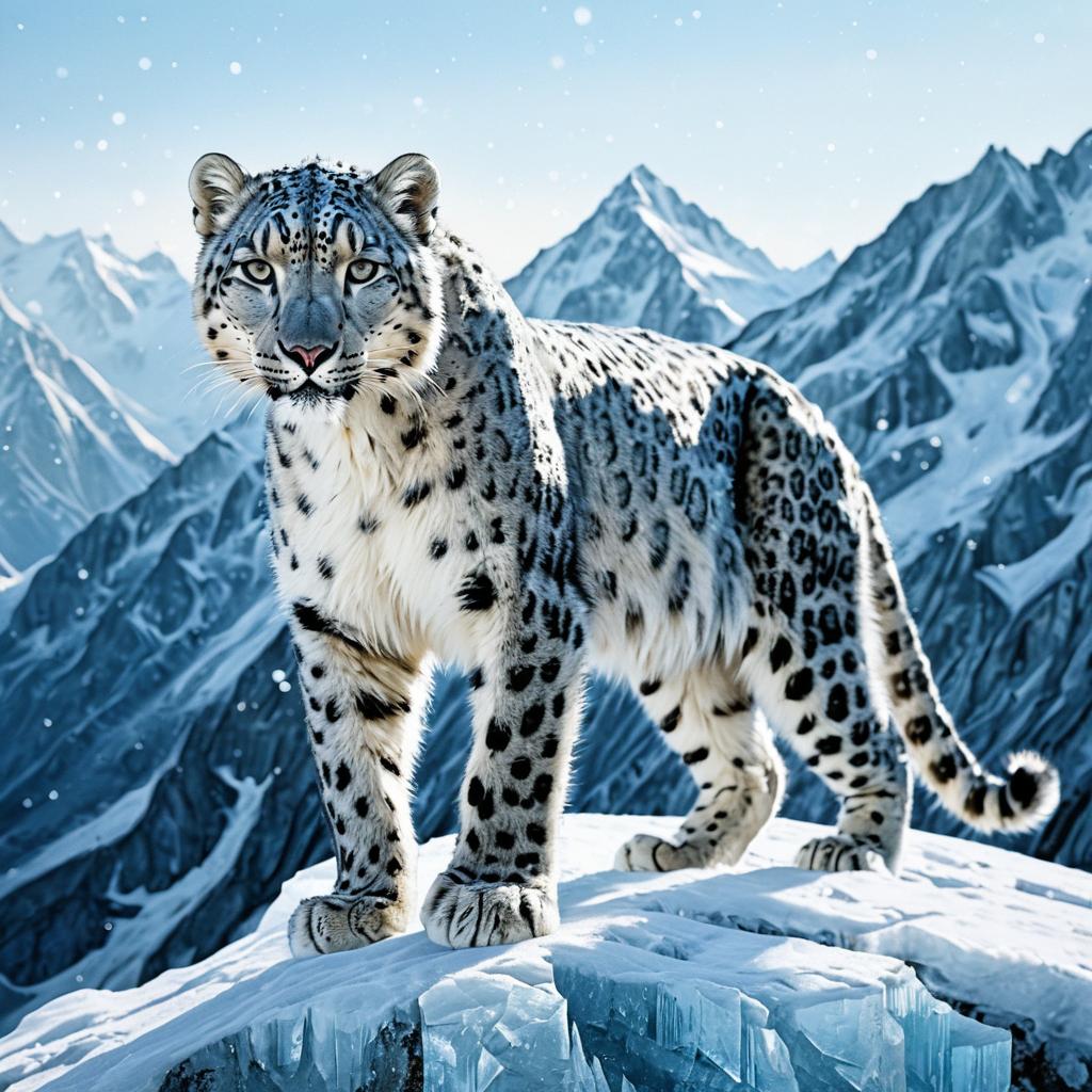 Fantasy snow leopard made of translucent frost crystals, with icy lace work patterns. Set in a glacial mountain peak, within a serene environment. Highly detailed ultra realistic digital oil painting with cold diffuse natural light.
