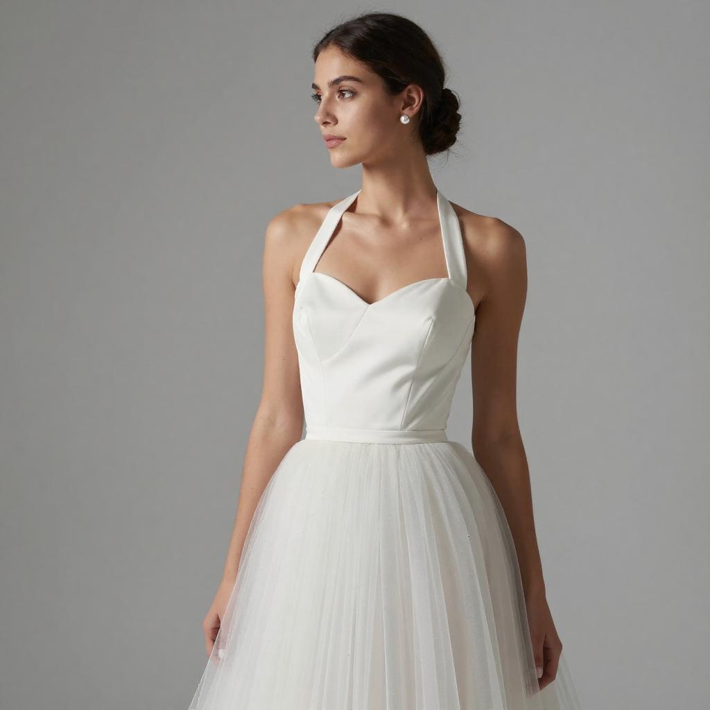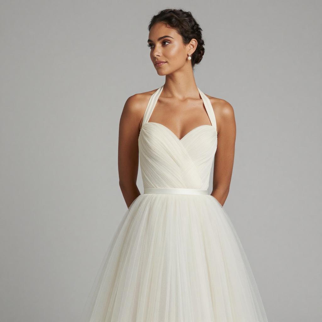 Photograph of a slender woman with tan skin and dark hair in an elegant updo. She wears a white, halter-neck, strapless dress with a sweetheart neckline and a full, tulle skirt. She has white pearl earrings and stands against a plain gray background, looking to the side with a serene expression.