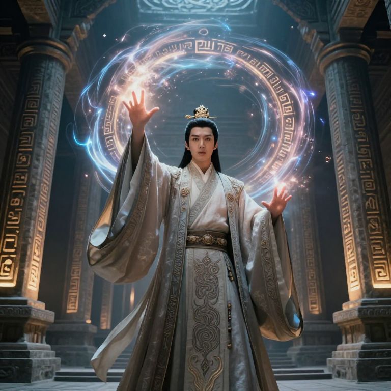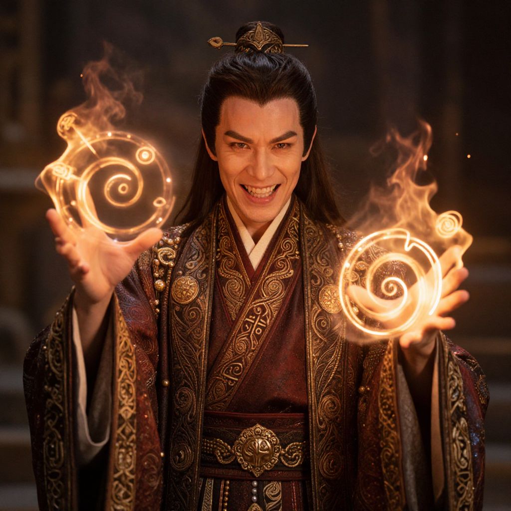 Spell smirk, elegant mage wearing ornate robes grinning slyly while conjuring fiery runes in mid-air, glowing symbols spiraling around hands, dramatic lighting, mystical fantasy setting
