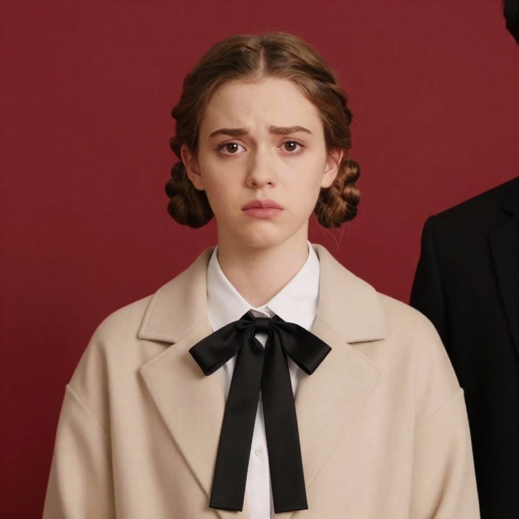 Photograph of a young woman with light brown hair, wearing a gray cardigan, white button-up shirt, and plaid skirt. She stands against dark, patterned curtains, covering her mouth with her right hand, looking surprised. Blue lighting. "MoviesstillDB.com" in the bottom right corner.