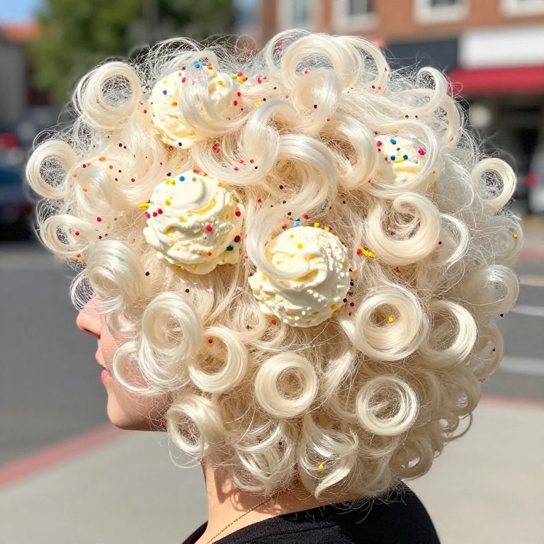 Fluffy ice cream haircut featuring voluminous curls mimicking ice cream scoops, layered with sprinkles and subtle candy colors on silky hair, vibrant street style, bright sunny day, intricate texture, playful and trendy atmosphere.