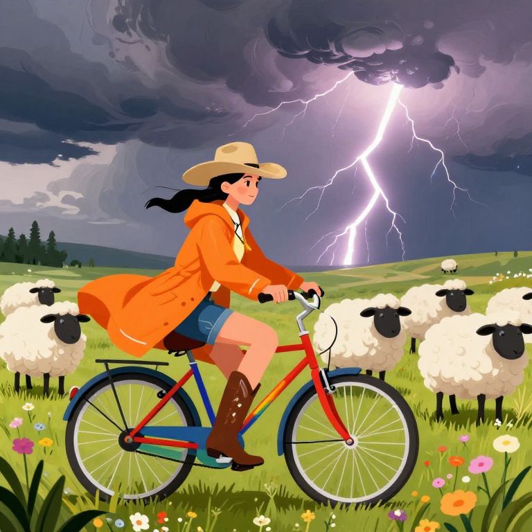 A vibrant digital illustration depicts a young woman with fair skin and dark hair, wearing a tan cowboy hat, orange coat, blue shorts, and brown boots, riding a red bicycle through a field of white sheep with black faces. The background features a dramatic, cloudy sky with a bright, jagged lightning bolt illuminating the scene. The field is lush with green grass and colorful wildflowers. Trees dot the horizon in the distance. The woman's confident posture and the dynamic lightning contrast with the serene pastoral setting, creating a striking visual effect.
