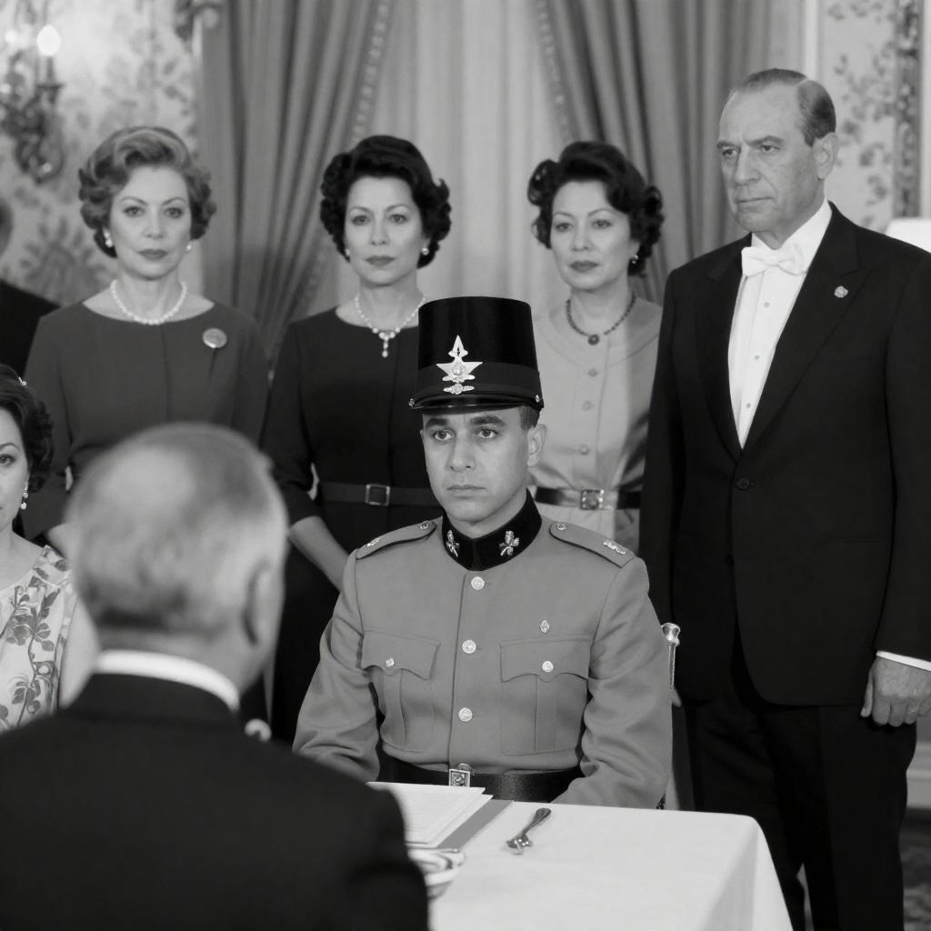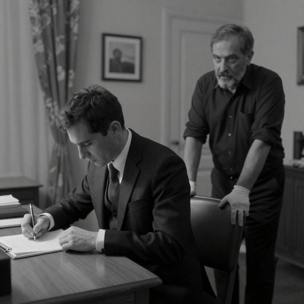 Black and white photograph of three men in a room. Elder man in military uniform with peaked cap, holding papers, standing left. Middle-aged man in dark suit, leaning forward, looking down, standing center. Young man in dark suit, standing right, looking forward. Dimly lit room with shelves and lights in background. Elder man's expression is serious, middle-aged man's expression is downcast, young man's expression is neutral.