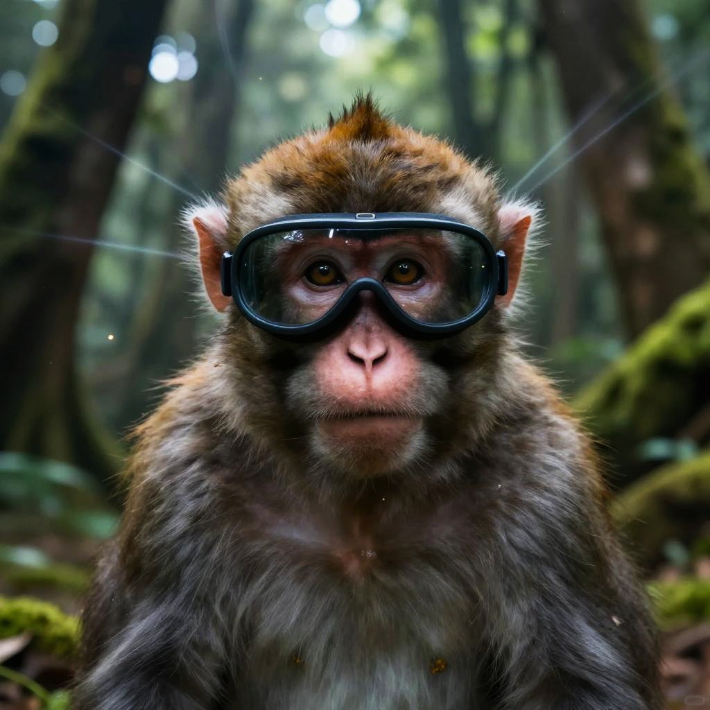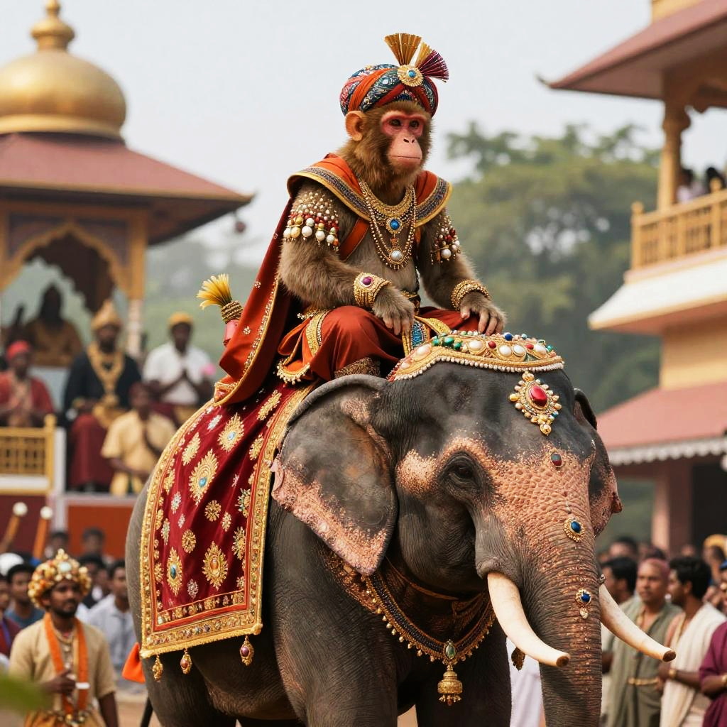 Monkey with turban meditating on a mountain top at sunrise, serene expression, detailed folds in turban fabric, soft pastel sky, peaceful natural environment, digital art
