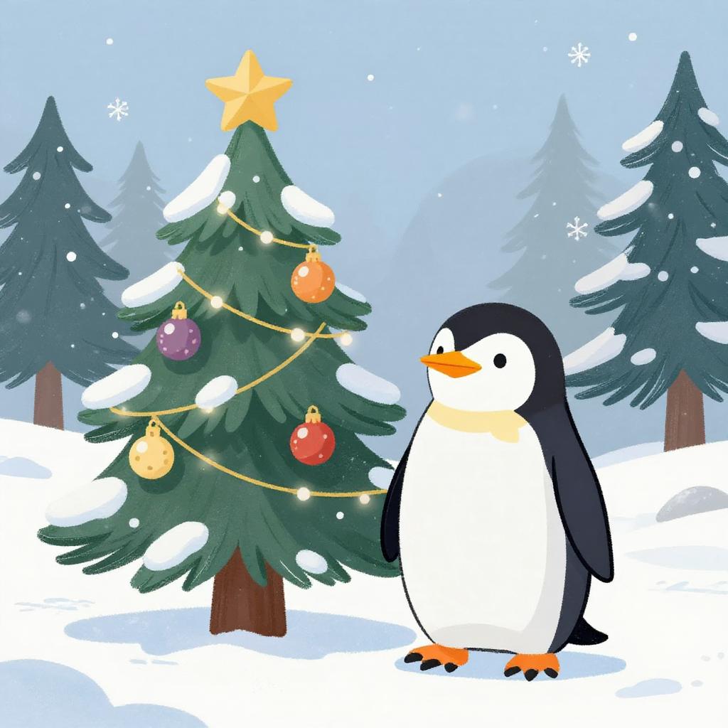Illustration of a penguin standing next to a decorated Christmas tree with snow-covered branches and colorful baubles. The background features snowy pine trees and falling snowflakes, creating a festive winter scene.
