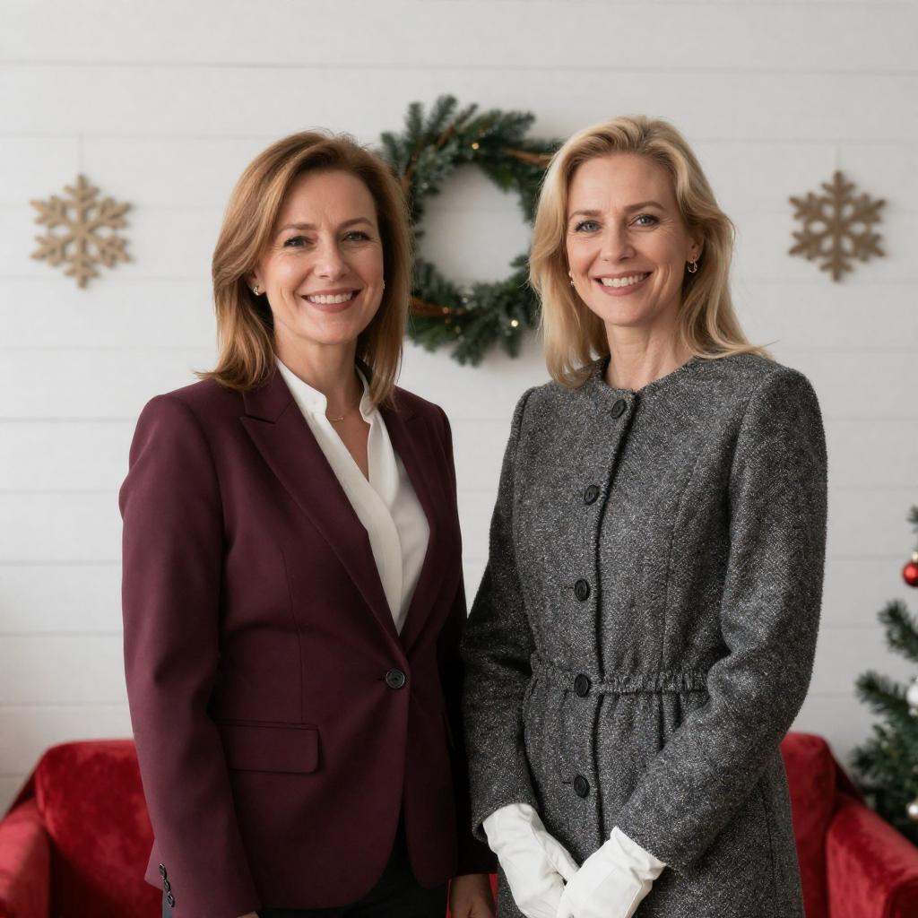 Photograph of two smiling women standing side by side. The woman on the left has light brown hair, wears a maroon blazer over a white blouse, and looks slightly to the right. The woman on the right has blonde hair, wears a gray tweed coat with white gloves, and looks directly at the camera. They are in front of a white wooden wall adorned with Christmas decorations, including snowflakes and a garland. A red cloth is draped in front of them.