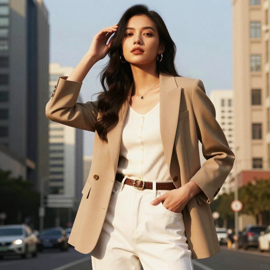This stylish image features a woman elegantly posing with her hand placed gracefully on her head. Her chic, neutral-toned outfit and sophisticated expression exemplify modern fashion aesthetics, perfect for editorial and lifestyle contexts.