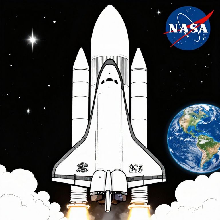 Realistic space shuttle coloring pages featuring detailed line art of a space shuttle launching into orbit, intricate NASA insignia, and background elements like stars and Earth, designed for educational and creative coloring activities.