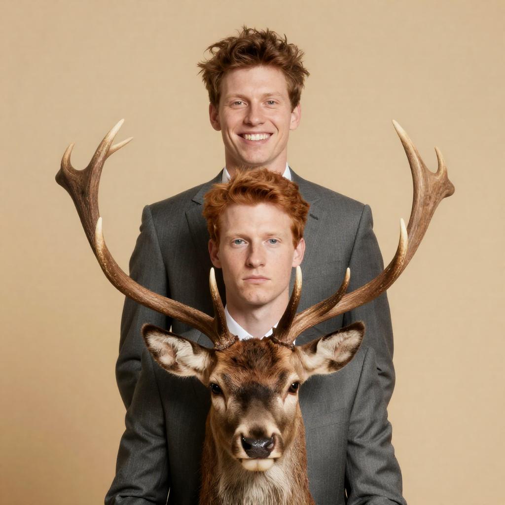 Photograph of two men in suits with large antlers on a yellow background. The man in the back has messy brown hair, smiles widely, and stands behind the man in the front with red hair, who looks serious. A deer with large antlers is in front of them. Both men wear gray pinstripe suits and white shirts. The deer's head is centered, facing forward.