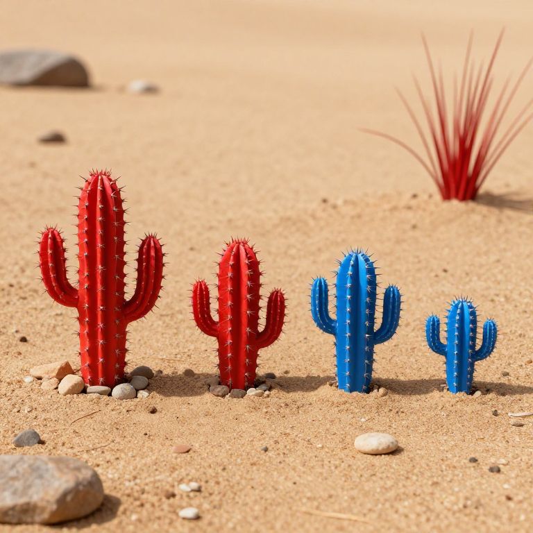 Photograph of three colorful plastic cacti (red, medium red, blue, small blue) on sandy desert ground with rocks and red grass.