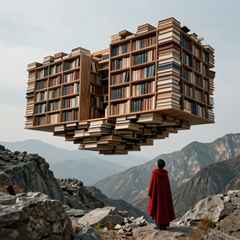 Surreal architecture emerges as a floating library constructed from stacked books, suspended above a rugged mountain landscape, with a solitary figure in a crimson cloak gazing upward from the rocky terrain below.