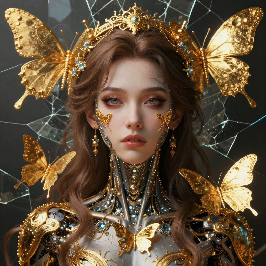 Sam Yang WLOP Artgerm Greg Rutkowski, 8k portrait of beautiful cyborg with brown hair, intricate, elegant, highly detailed, majestic, digital photography, art by artgerm and ruan jia and greg rutkowski surreal painting gold butterfly filigree, broken glass, (masterpiece, sidelighting, finely detailed beautiful eyes: 1.2), hdr, realistic, high definition