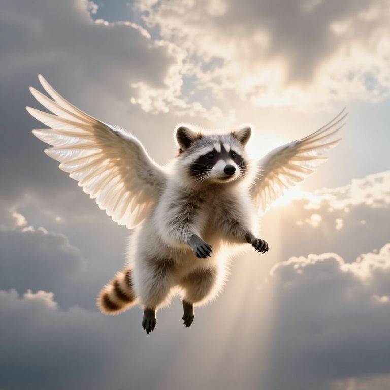 An albino raccoon with snow-white, soft fur and a cute, friendly expression hovers in the sky, Instead of front paws, it has shimmering, radiant wings, and its hind legs resemble bird claws with sharp talons, making it even more extraordinary, The raccoon appears suspended in mid-air, its wings slightly slowed, as if pausing for a moment to gaze at us, Behind the raccoon stretches an endless sky filled with massive gray clouds, beginning to part, A warm sun emerges from the clouds, casting golden light across the scene, One particularly bright ray falls directly on the raccoon, surrounding it with a soft glow and creating a luminous halo, This light emphasizes its angelic appearance and mysterious nature, adding a touch of magic and harmony to the moment