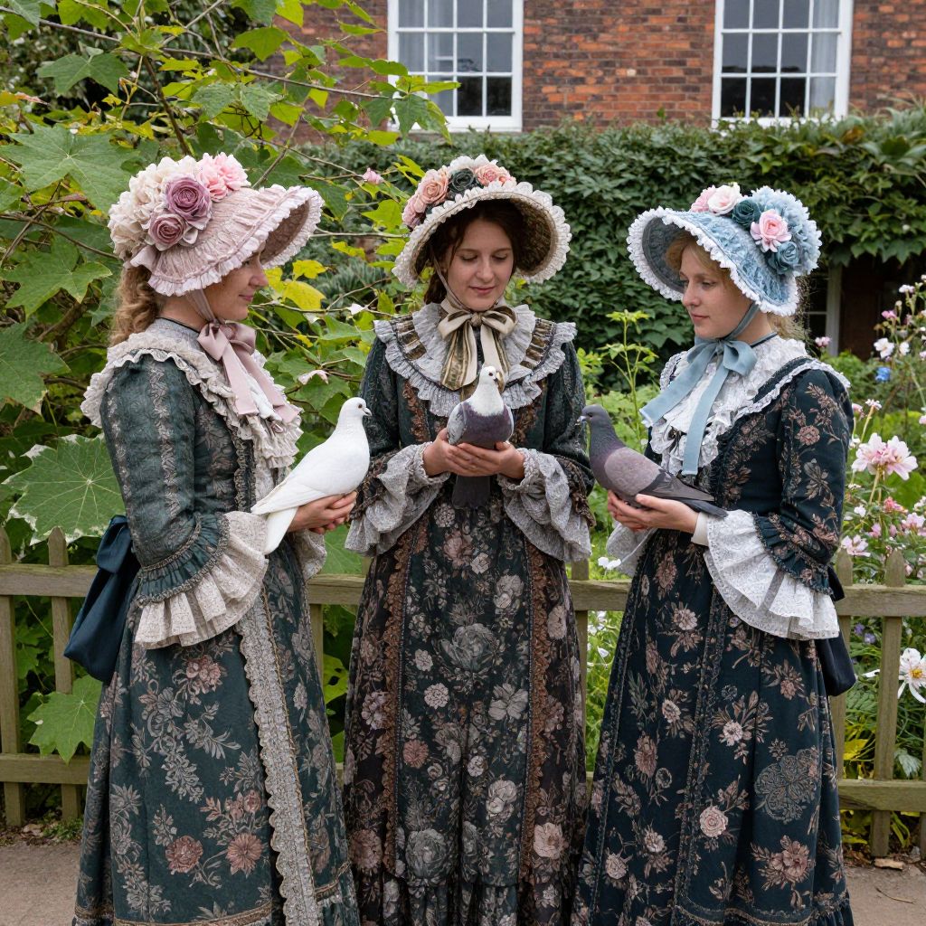 In the garden, three women dressed in elaborate, Victorian-era dresses with floral patterns and large bonnets stand in a group, each holding a pigeon. The dresses are dark green with intricate floral designs, and the bonnets are adorned with pink and white flowers. The garden is lush with greenery, including large leaves and a flowering bush. The women are positioned in a triangular formation, with one woman in the foreground holding a pigeon, another in the middle, and the third in the background. The garden is enclosed by a wooden fence, and a brick building with large windows is visible in the background. The scene is serene, with the women and pigeons appearing to be in a moment of quiet interaction.