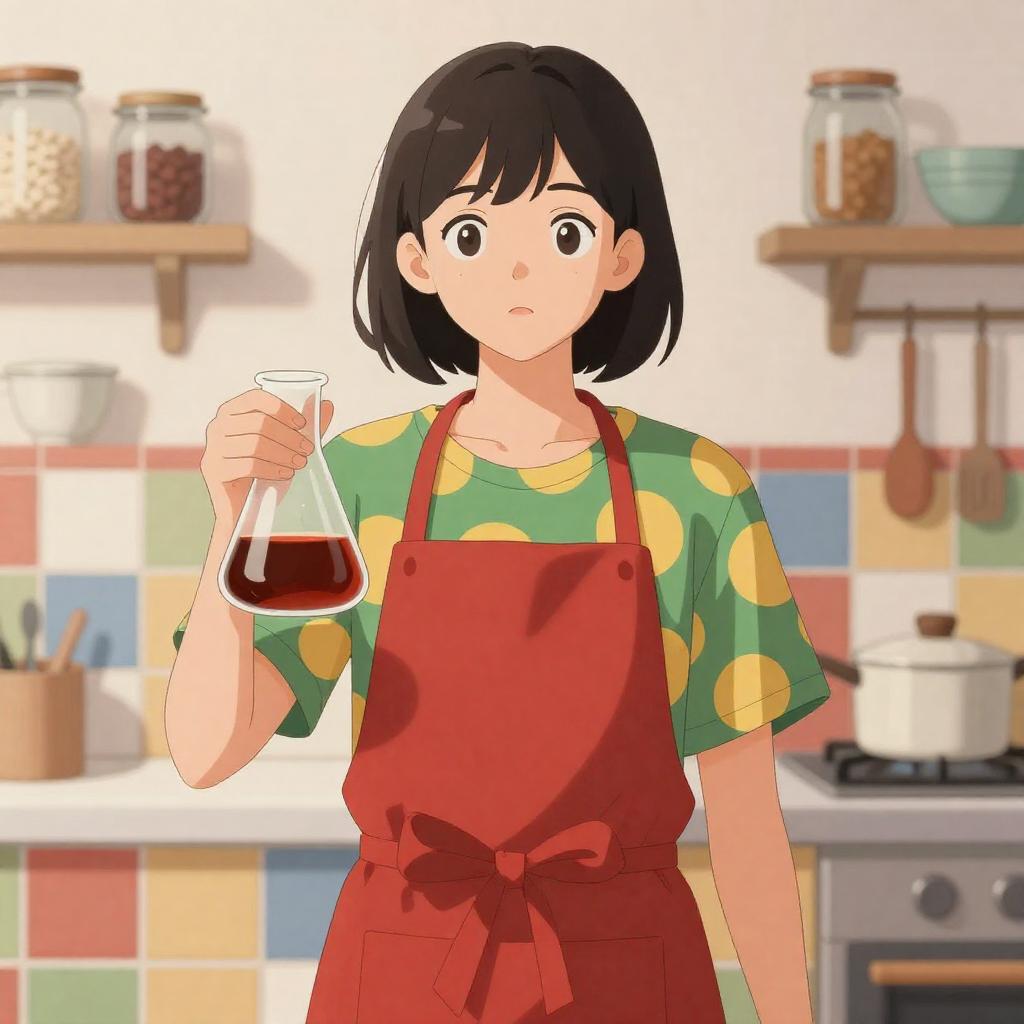 A digital illustration of a young woman with short black hair, wearing a red apron over a green and yellow patterned shirt, holding a glass flask with dark liquid. She stands in a brightly lit kitchen with colorful tiles and shelves filled with jars and dishes in the background.