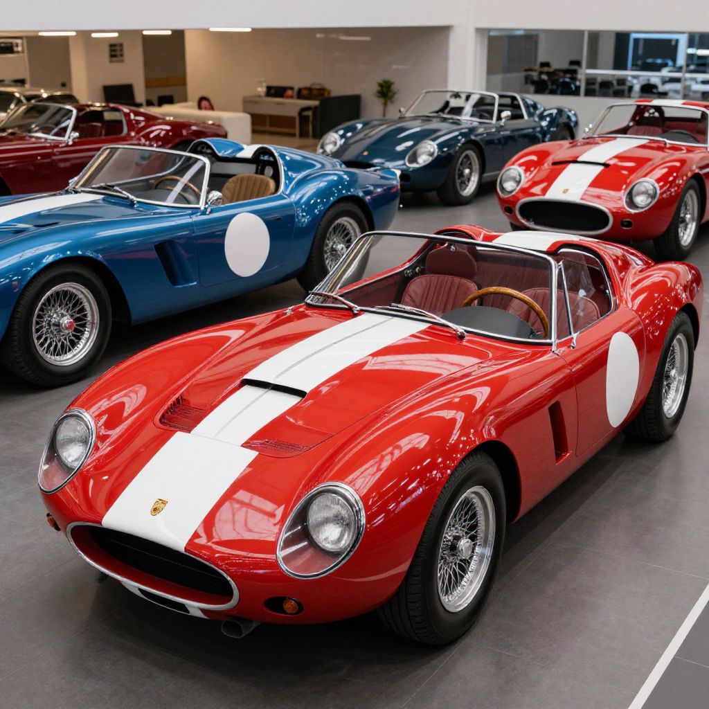 Photograph of a showroom displaying three classic sports cars: a red Ferrari with white stripes, a blue car with a white circle, and another red car