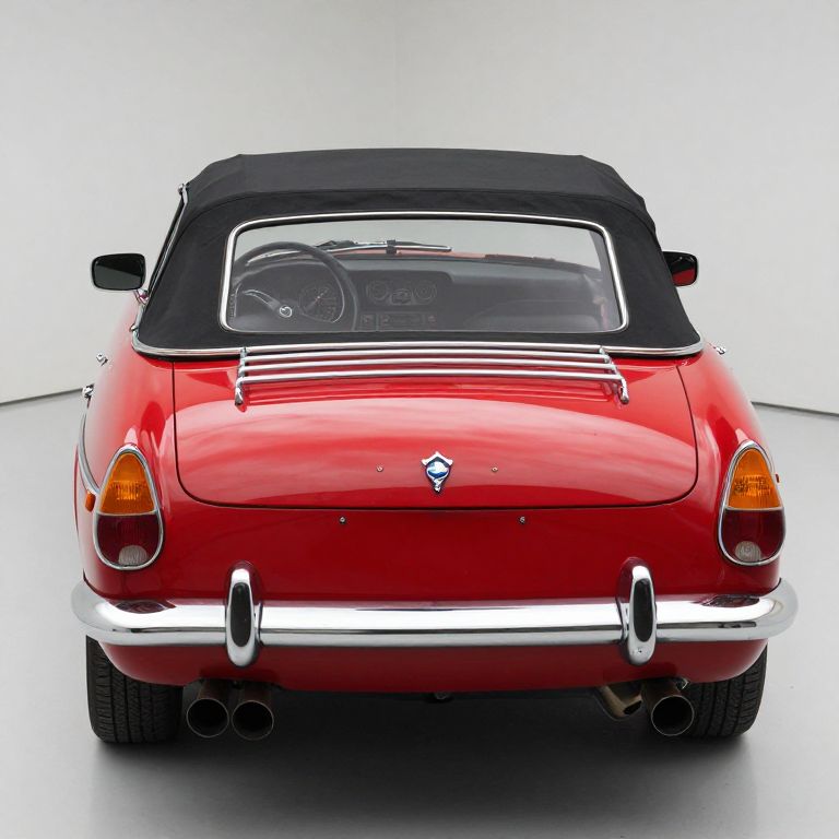 Photograph of a bright red classic sports car viewed from the rear. The car has a black convertible top, chrome-trimmed rear bumper, and dual exhaust pipes. The round, amber tail lights are positioned on either side of the car's rear end. A chrome emblem is centered on the back, just above the license plate area. The car's glossy red paint reflects light, highlighting its smooth curves. The background is a clean, white studio setting, emphasizing the car's vibrant color and classic design.