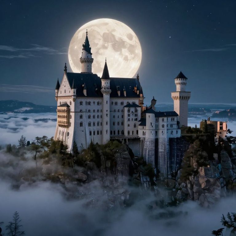 Photograph of a Gothic-style castle with multiple pointed turrets and towers, illuminated by a large, bright full moon in the night sky. The castle is surrounded by mist and clouds, with dark, dense trees at its base. The moon's light casts a dramatic glow on the castle's white and grey stone walls. The sky is deep blue, dotted with stars, enhancing the mystical atmosphere. The castle's architecture features intricate details and small, dark windows. The overall scene is enchanting and magical, evoking a fairy-tale-like ambiance.