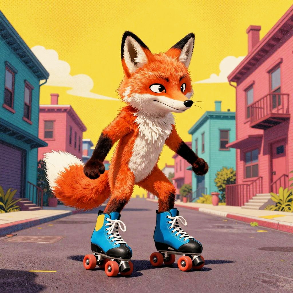 Lowbrow art of a playful fox wearing rollerblades, influenced by Roy Lichtenstein, with a bright comic book style neighborhood, vibrant colors, grungy textures, playful and surreal elements