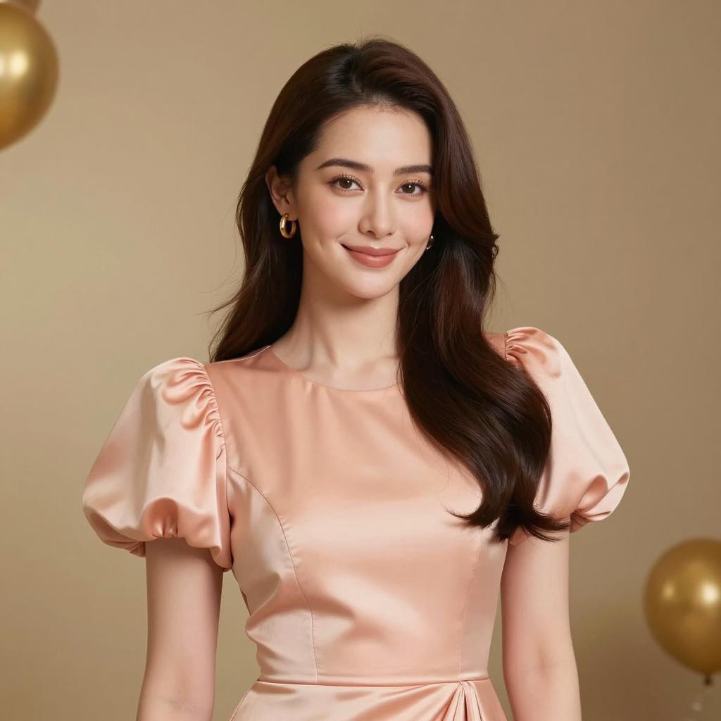 Photorealistic portrait of an Asian woman with long brown hair standing in a sunny floral garden. She is wearing a light pink, long-sleeved flowy dress with subtle pleats and has a calm, serene expression. The background features colorful blooming flowers and bright green foliage under soft natural light. The woman has light makeup with pink lipstick and wears subtle earrings, presenting a casual yet elegant style on a summer day.