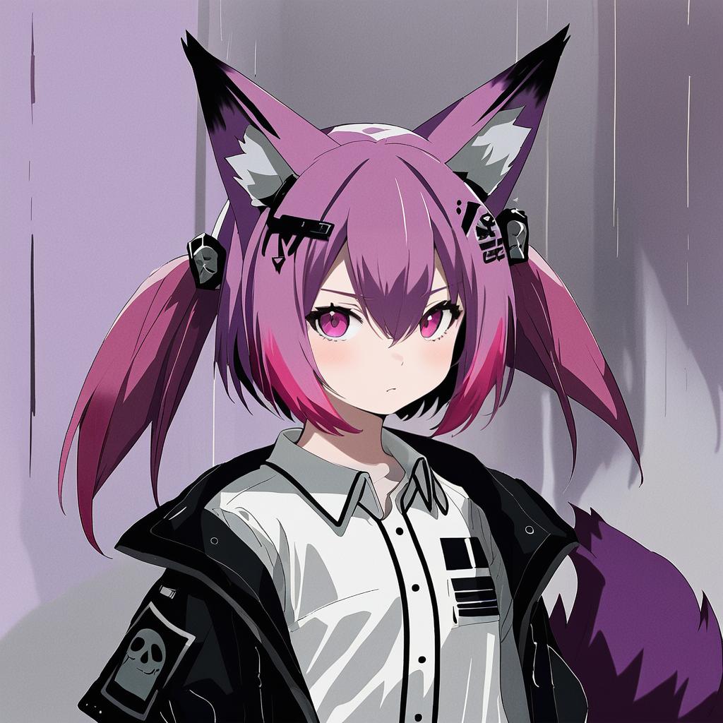 Morte (arknights), arknights, 1girl, fox girl, animal ear fluff, fox ears, fox tail, hair between eyes, pink eyes, red eyes, pink hair, short hair, purple hair, twintails, hair ornament, white shirt, stuffed animal, by artist shirogane hina, animagine