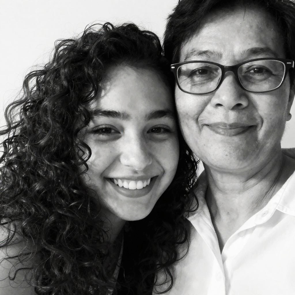 This black-and-white close-up photo features a smiling young woman with curly hair and a mature woman with glasses, both leaning closely together. The younger woman's face is partially shadowed by the older woman's hair, creating a playful and affectionate vibe. The older woman's expression is gentle and content. The photo has a soft, grainy texture and a warm, intimate feel.