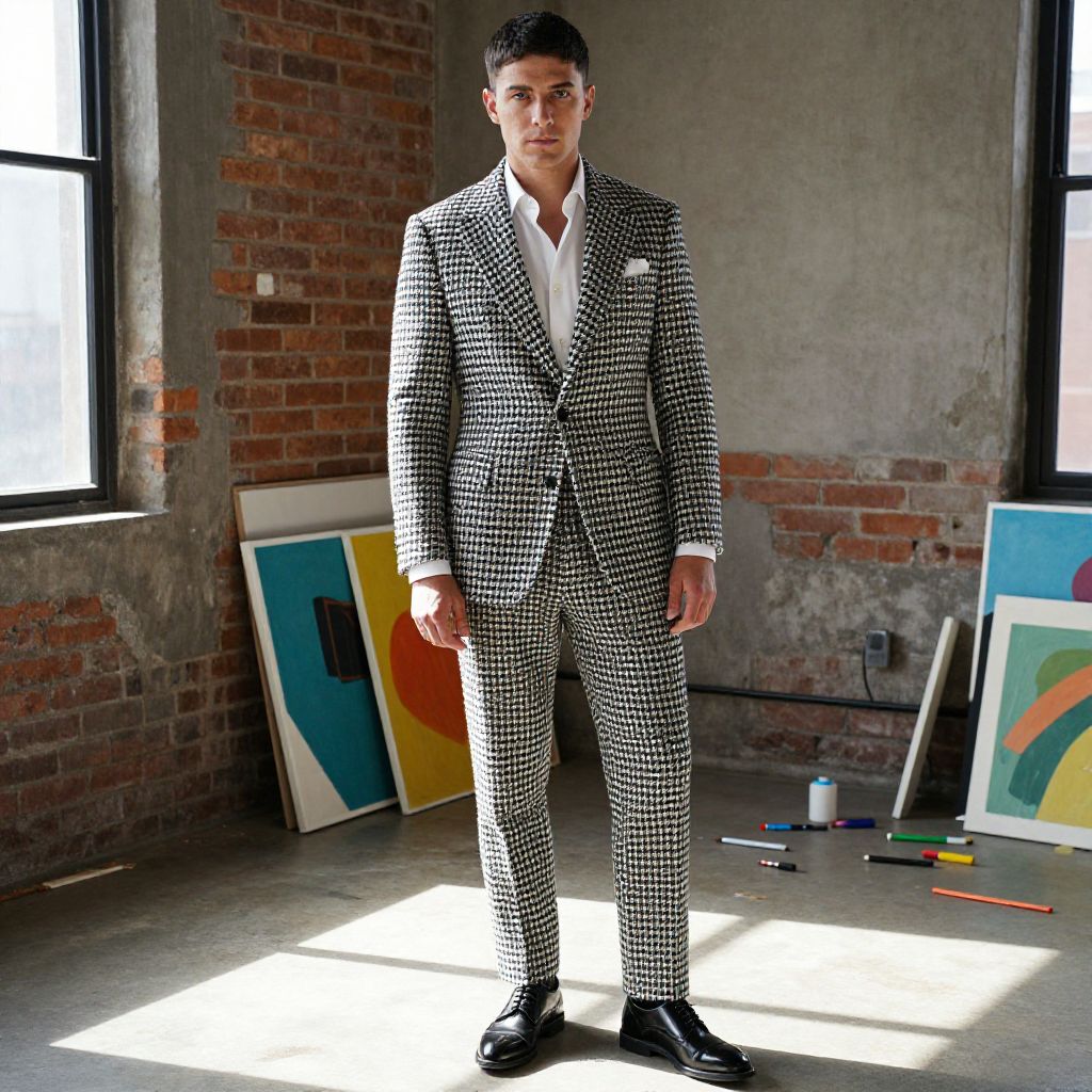 A man, classic black and white houndstooth suit, structured wool fabric, peak lapel jacket, fitted white dress shirt, glossy black derby shoes, sunlit loft, exposed brick walls, colorful art supplies scattered, kodachrome analog film, confident expression. Man has masculine face and piercing eyes