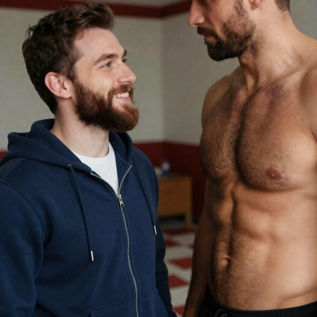 Photograph of a muscular, shirtless man with short, dark hair, standing in front of a full-length mirror. He holds a yellow towel, looking at his reflection. He wears blue jeans and a white belt. Reflection shows his toned chest and arms. Wooden-paneled room with a wall sconce and plant in the background. Mirror frame is metallic. He stands with a neutral expression. Two mirrors show his front and back views.