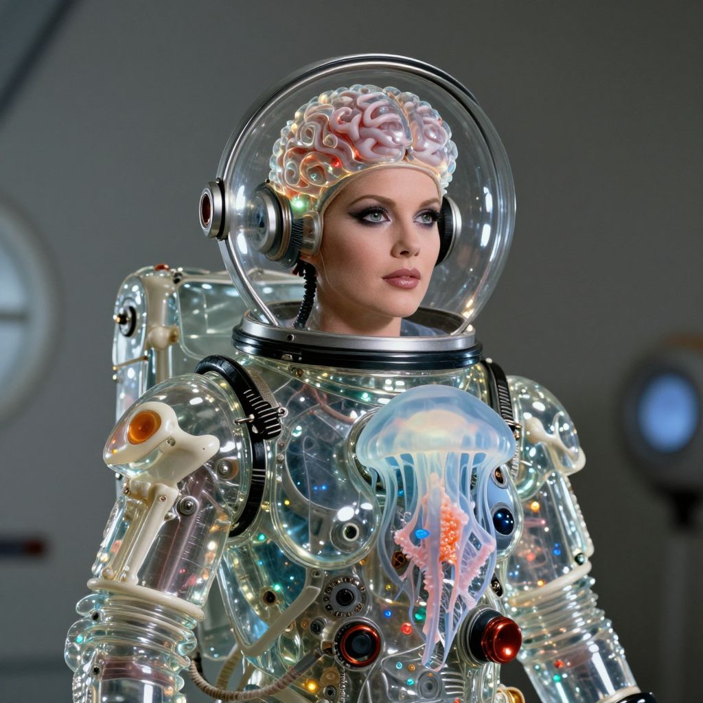 Photograph of a futuristic, female astronaut with a translucent helmet, revealing a brain-like headpiece beneath. Her suit is a complex, reflective mix of glass and metallic components, adorned with colorful lights and organic shapes, including a glowing jellyfish on her chest. Her makeup is dramatic, with bold eye makeup. The background is a dimly lit, futuristic space station with circular windows. The image has a sci-fi, cyberpunk aesthetic, blending organic and technological elements. The astronaut's expression is intense, with a focused gaze.