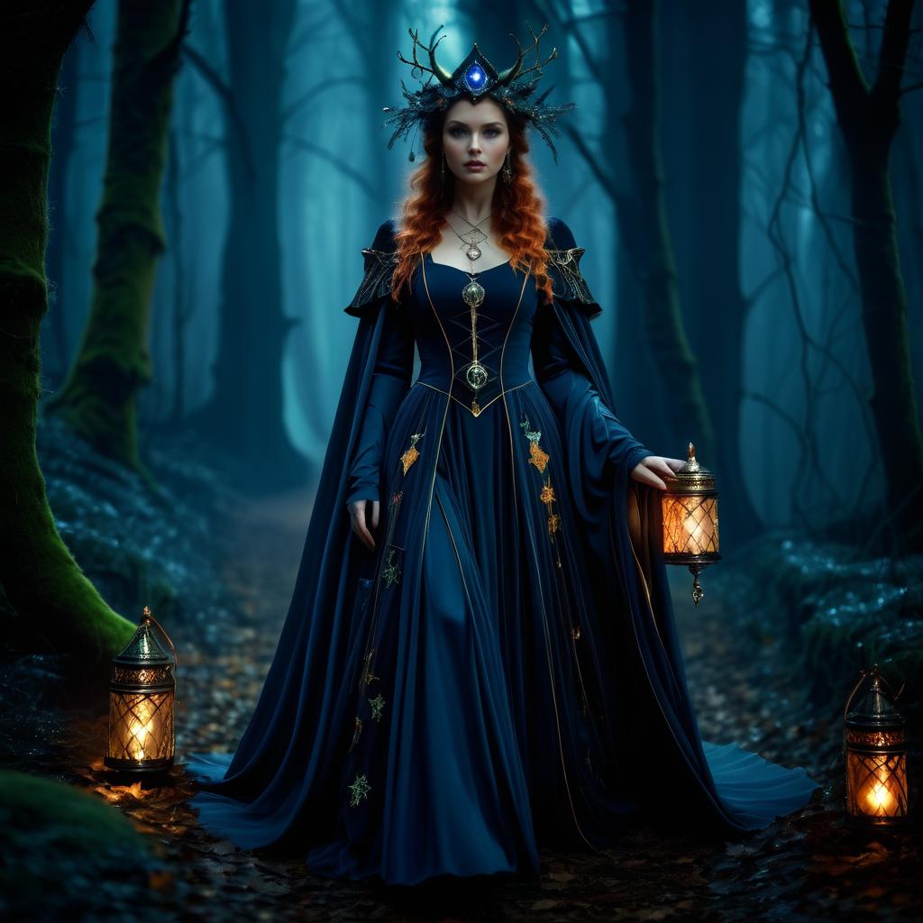 A stunning red-haired woman dressed as a witch stands on a dark forest path at night. She wears an elaborate dark blue gown adorned with mystical symbols and embroidery, with a matching cape. Her headpiece is intricate, featuring antler-like branches and a glowing blue gem. She holds a vintage lantern emitting warm light, surrounded by other lit lanterns on the forest floor. The scene has a cinematic, high-detail style with moody, cool color grading.