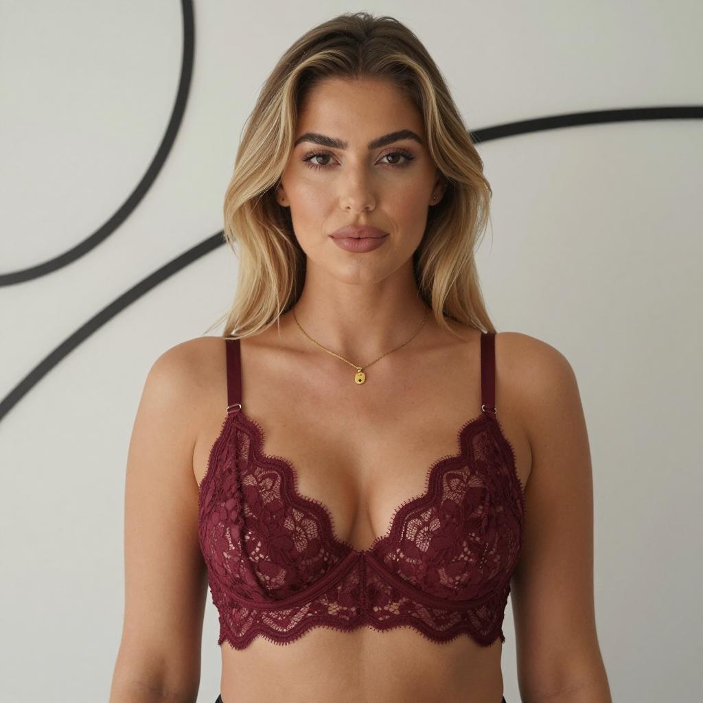 Photograph of a woman with light skin, long blonde hair, and dark eyebrows, wearing a maroon lace bra. Her full breasts are prominently displayed, with the bra featuring floral lace patterns. She has a neutral expression, looking directly at the camera. A gold necklace with a small pendant is around her neck. The background is a light-colored wall with abstract black lines. She has a slight smile, with defined eyebrows and full lips. The image focuses on her from the waist up.