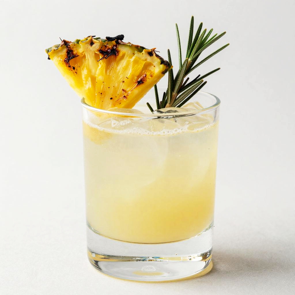 A charred pineapple mezcal cocktail in a smoke-tinted rocks glass, garnished with torched pineapple slice and charred rosemary sprig. This artistic representation features bright colors and a minimalistic design, creating an inviting atmosphere for a refreshing summer drink.
