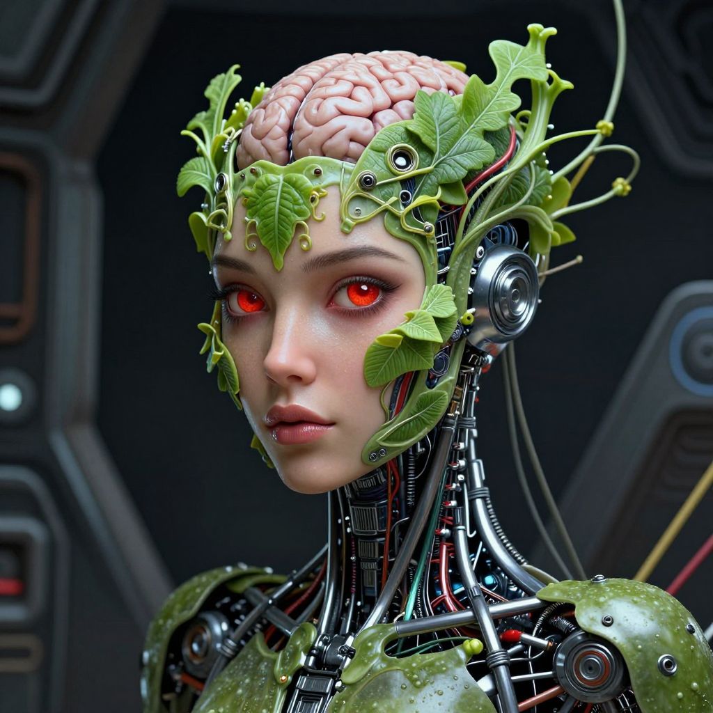 CGI image of a cybernetic woman with a human brain headpiece, green leafy vines, glowing red eyes, and intricate mechanical parts.