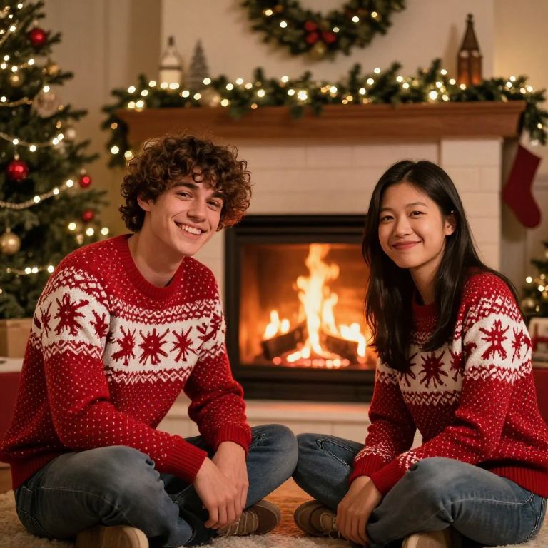 A cozy Christmas evening scene featuring two friends wearing matching red and white Christmas sweaters, smiling warmly as they sit by a crackling fireplace in a snug, decorated living room with pine trees and twinkling lights in the background; one person has curly brown hair and a kind, friendly face, the other has straight black hair and a slightly mischievous grin.