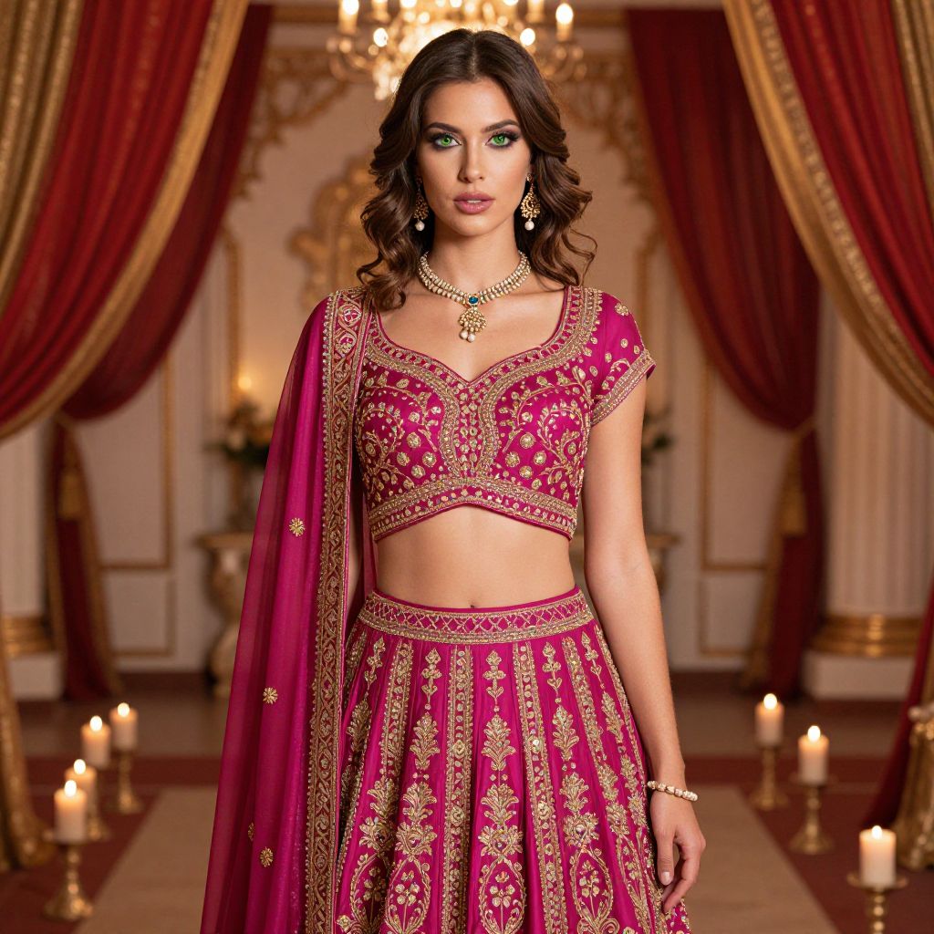 A model with medium-length wavy brown hair and bright green eyes wearing a beautifully structured magenta colour lehenga as a costume during a themed evening event in a palace-like indoor setting with traditional decorations, soft candles, and red and gold drapes in the background.