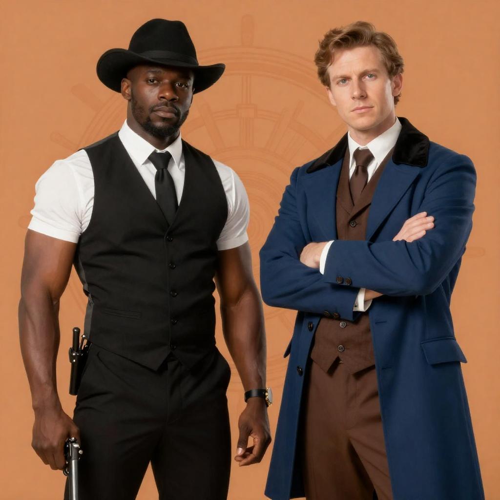 Two men in 19th-century attire. The left man, Black, muscular, wearing a black vest, white shirt, black tie, and black hat, holds a pistol. The right man, white, in a blue coat, brown vest, white shirt, and brown tie, stands with arms crossed. Orange background with a faint mechanical design.