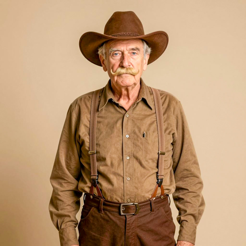 Mustache costume character, photograph of an elderly white man, standing, facing forward, wearing brown cowboy hat, brown long-sleeve shirt, brown suspenders, brown pants, mustache, tan background, realistic style, vintage appearance, detailed ures, soft lighting, neutral expression, centered composition, portrait orientation