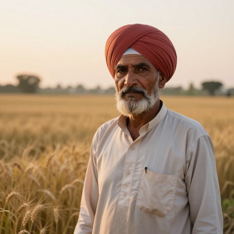 Portrait of a pinjabi farmer in traditional dress with a turban, standing in golden wheat fields during sunset, rustic textures, earthy tones, detailed facial features showing wisdom and resilience, peaceful countryside environment, soft glowing light