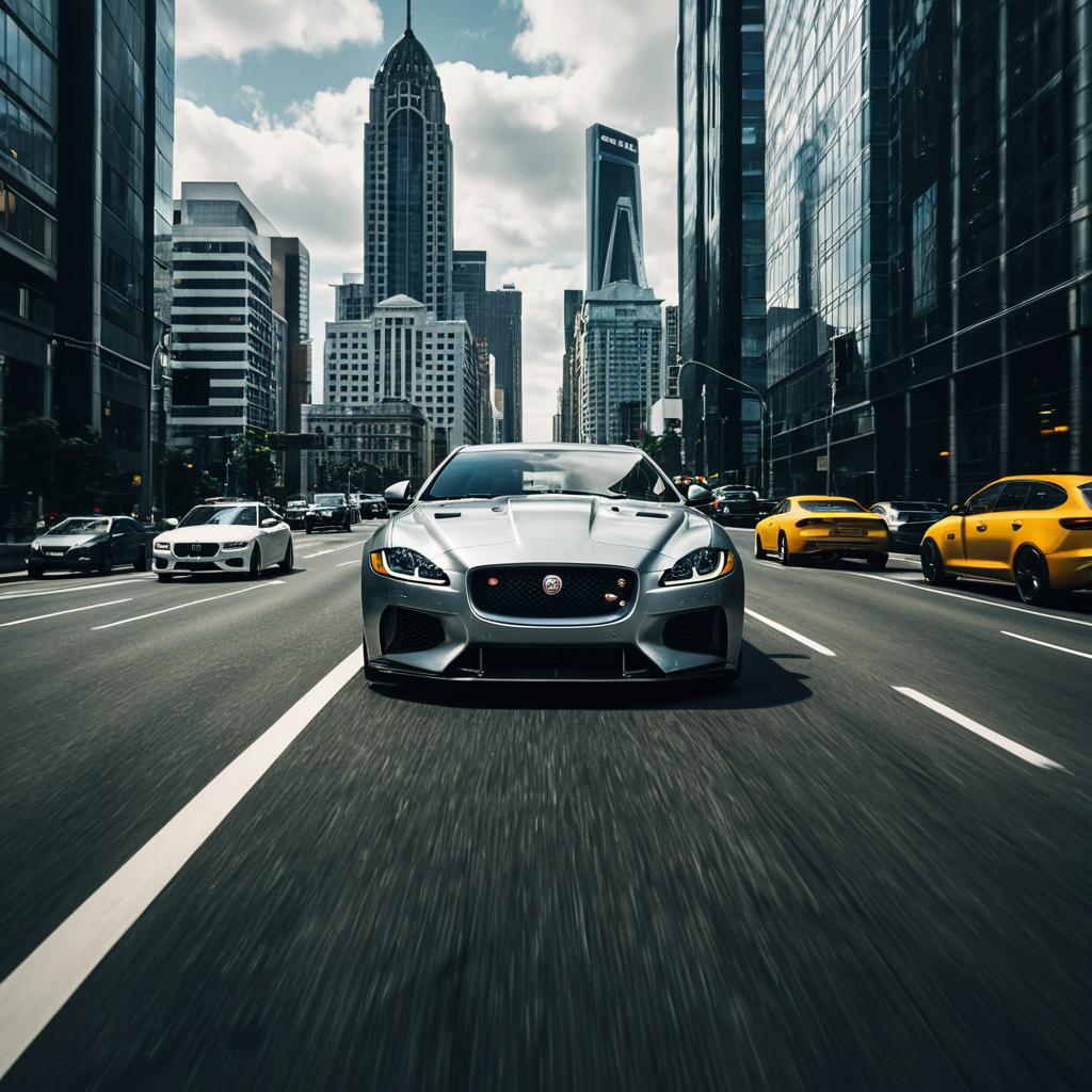 A cinematic shot of a tuned jaguar car, drifting through traffic in a city atmosphere. there are skyscrapers far in the background down the road. In style of gran turismo. Ultra realistic reflections. Sunny and cloudy at 7 pm.