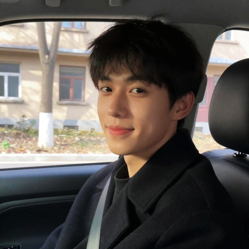 Young man with short dark hair, intense gaze, wearing black leather jacket, seated in red car, right hand on door frame, dimly lit interior, nighttime setting.