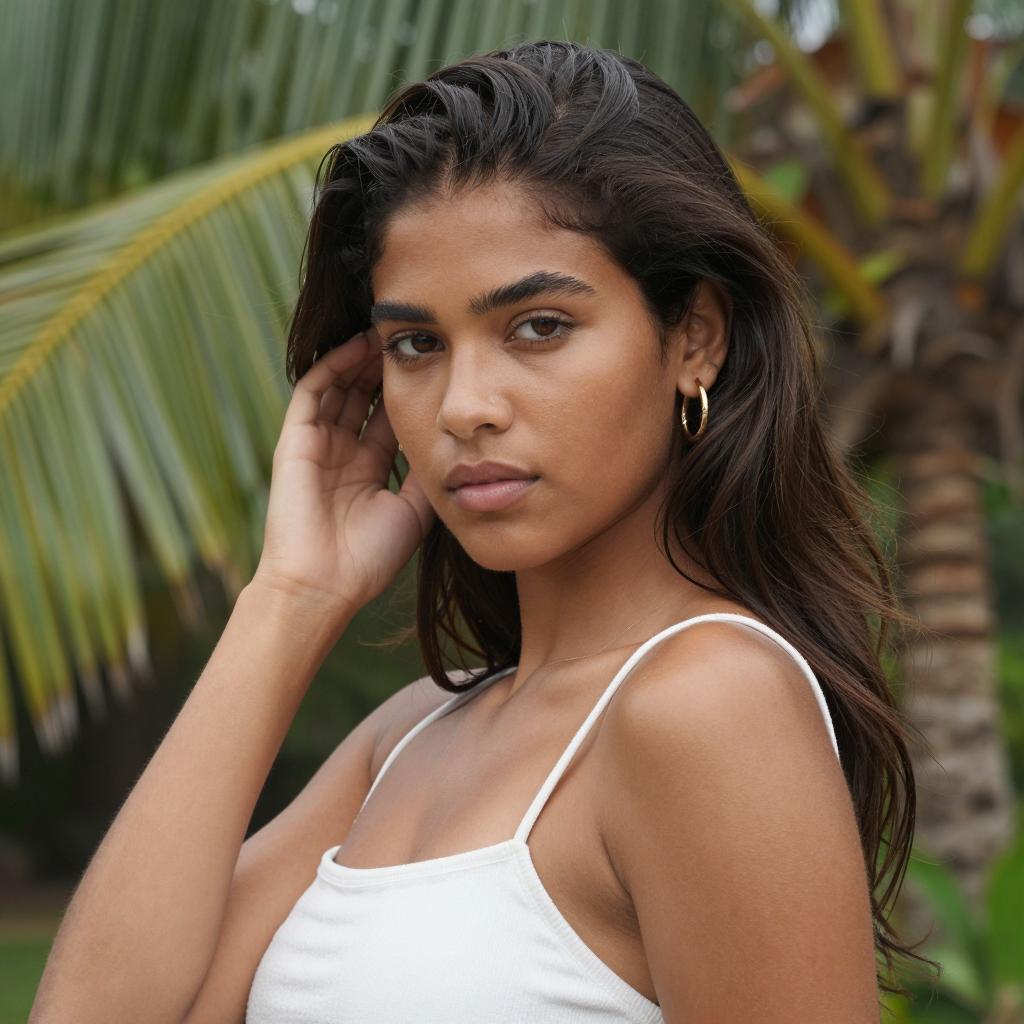 Young woman with dark skin and long, wavy black hair. She wears a white sleeveless crop top, high-waisted blue jeans, large gold hoop earrings, and multiple gold chain necklaces. She is sitting against metal bleachers, looking directly at the camera with a neutral expression. Her makeup includes bold eyebrows, pink eyeshadow, and glossy pink lips. The background shows blurred people and greenery. Photographic style.