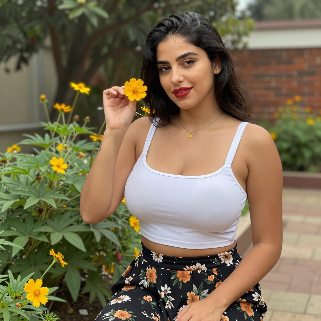 Portrait of a young woman with dark skin and long wavy black hair, wearing a white sleeveless crop top and high-waisted blue jeans. She accessorizes with large gold hoop earrings and layered gold chain necklaces. Her makeup features bold eyebrows, pink eyeshadow, and glossy pink lips. She sits confidently against metal bleachers with a blurred background of people and greenery.