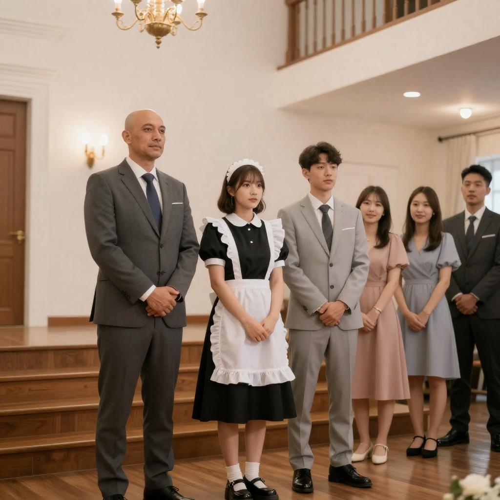 Photograph of a wedding ceremony in an elegant, well-lit hall. A bald, middle-aged man in a gray suit stands left, while a woman in a black and white maid outfit stands center, holding hands with a man in a light gray suit. Five guests, three women in dresses and two men, stand to the right. Warm lighting, wooden stairs, and a chandelier adorn the background.