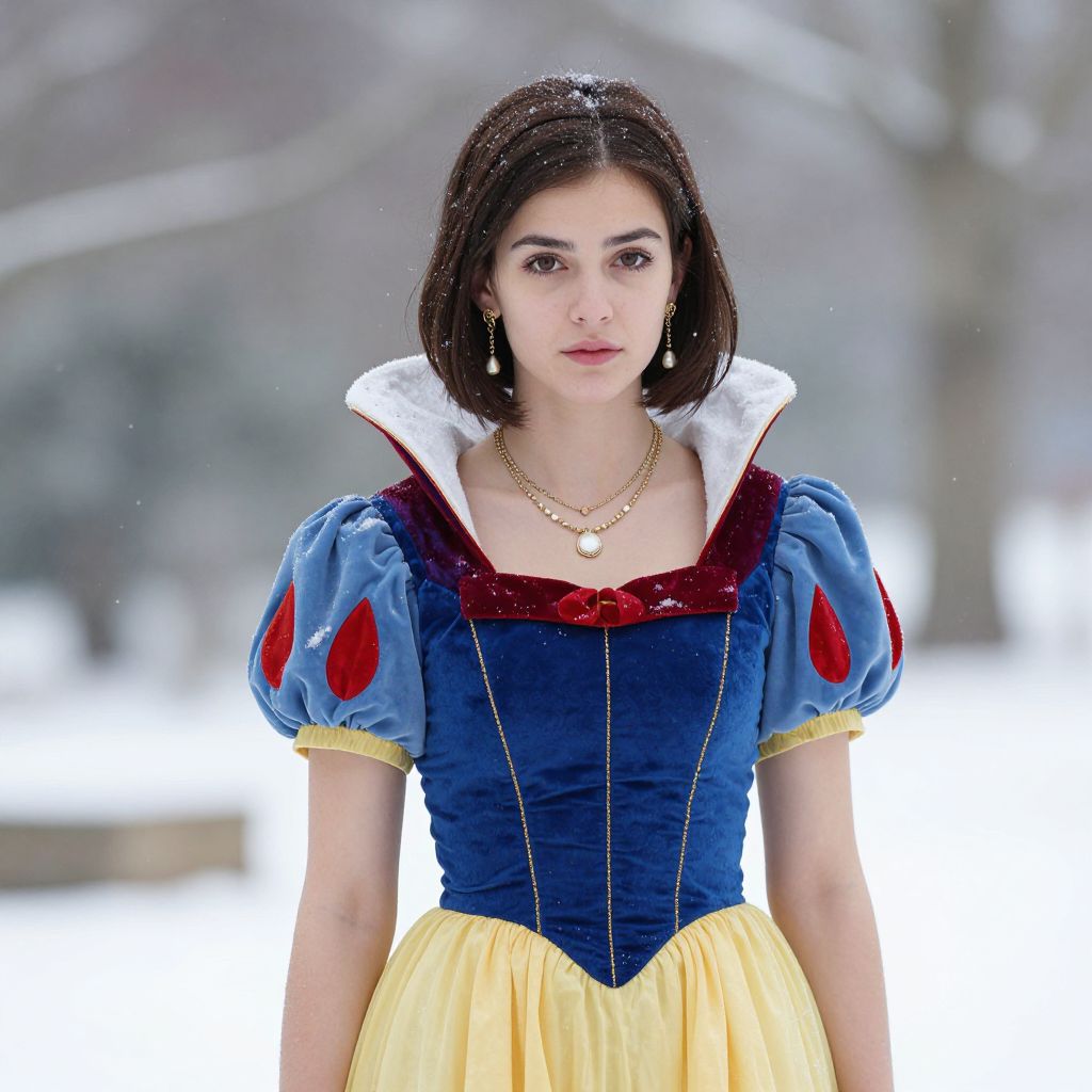 Photograph of a young woman with fair skin and dark brown bob haircut, wearing a blue and yellow Snow White costume, standing in a snowy, blurred