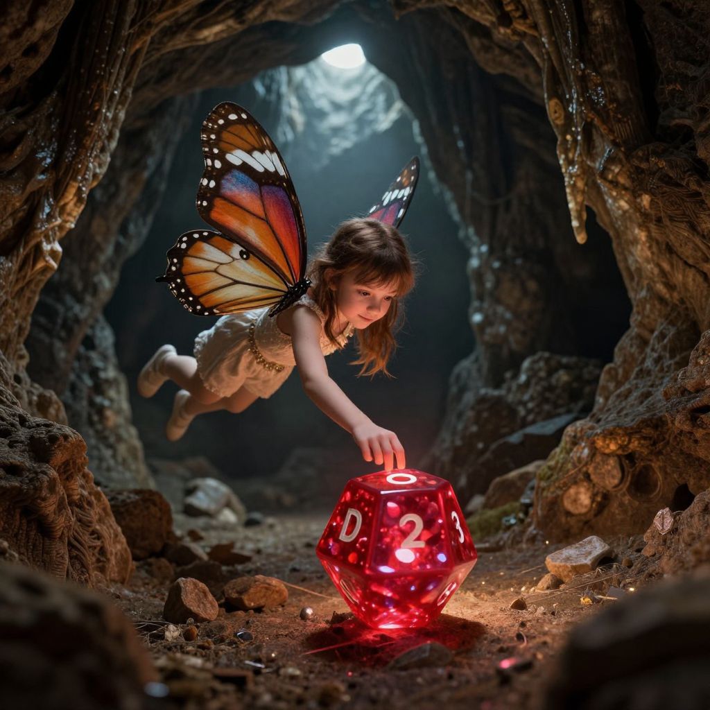 Photograph of a fairy-like child with orange and black butterfly wings, light brown hair, and wearing a beige dress, hovering in a dark, rocky cave. She reaches out with her right hand to touch a glowing red, translucent d20 (a 20-sided die). The cave has rough, textured walls and a small opening at the top, allowing light to filter in. The background includes scattered rocks and a soft, ethereal glow from the moonlight outside. The child's expression is focused and curious, adding a whimsical, magical atmosphere to the scene.