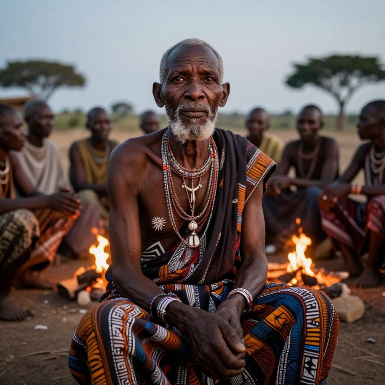 Photograph of an elderly African man with dark skin and a white beard, sitting in front of a small fire in a rural setting. He wears a black cloth with colorful, patterned stripes, adorned with multiple silver necklaces and bracelets. His expression is serious, with deep-set eyes. In the background, blurred figures of other men sit around the fire. The sky is light blue, and acacia trees are visible in the distance. The ground is dusty, and the fire casts a warm, orange glow on the scene.